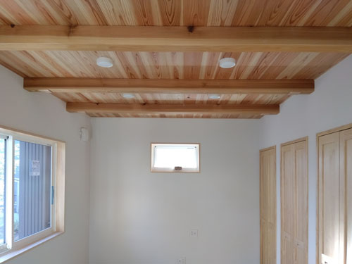 壁紙のエッグパルプの落ち着いた色合いが天井の杉羽目板や無垢材の