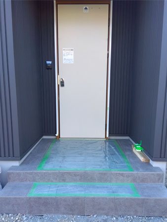 玄関ポーチのタイル張りも職人さんが寒い中、黙々と作業を