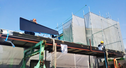 昨日より、兵太夫の店舗(美容院)併用住宅の建て方を行っています。 お天気も良く朝からクレーン車で、次々と資材がつり上げられ、棟が上がり・屋根の野地板張りまで順調に進み、一日目は終了となりました。 2日目の今日は、お天気が … 続きを読む 建て方2日目 ~兵太夫の家~