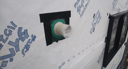 兵太夫のお家の外壁には、高密度ポリエチレン不織布タイベック®を建材用途に使用した透湿・防水シート(ハウスラップ)が貼り終わり、壁貫通部の防水処理を行っていました。 外壁貫通部とは換気扇・ガス管・給排水管などを外部へと通す … 続きを読む 外壁貫通部 ~兵太夫のお家~