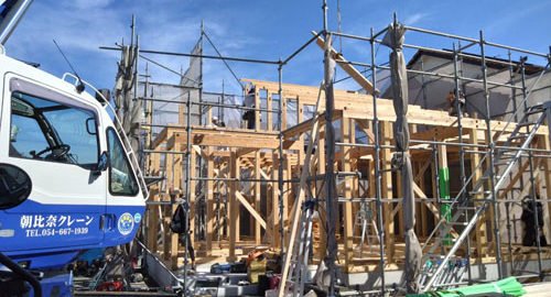 本日、三右衛門新田のお家の建て方を行いました。 気持ちの良い晴天に恵まれ、順調に工事も進んでいきました。まだまだ作業をするには残暑が厳しい一日でしたがチームワークの良さが心地よいかけやの音となり響き渡っていました。材木の … 続きを読む 祝 ~三右衛門新田の家~