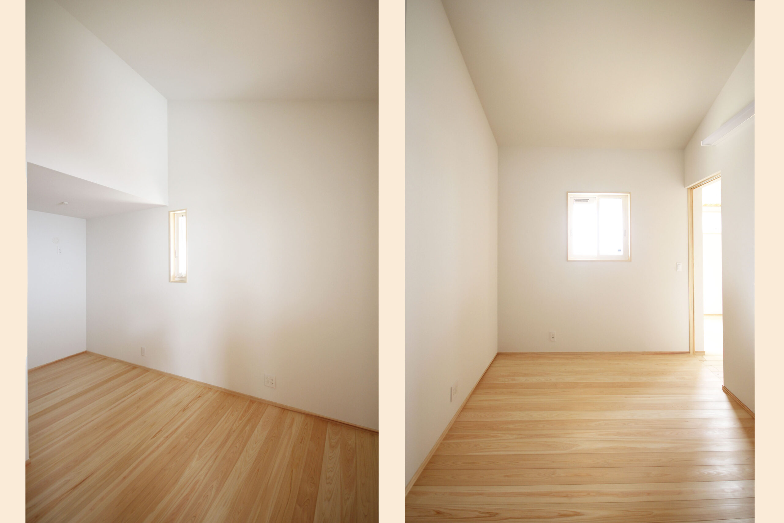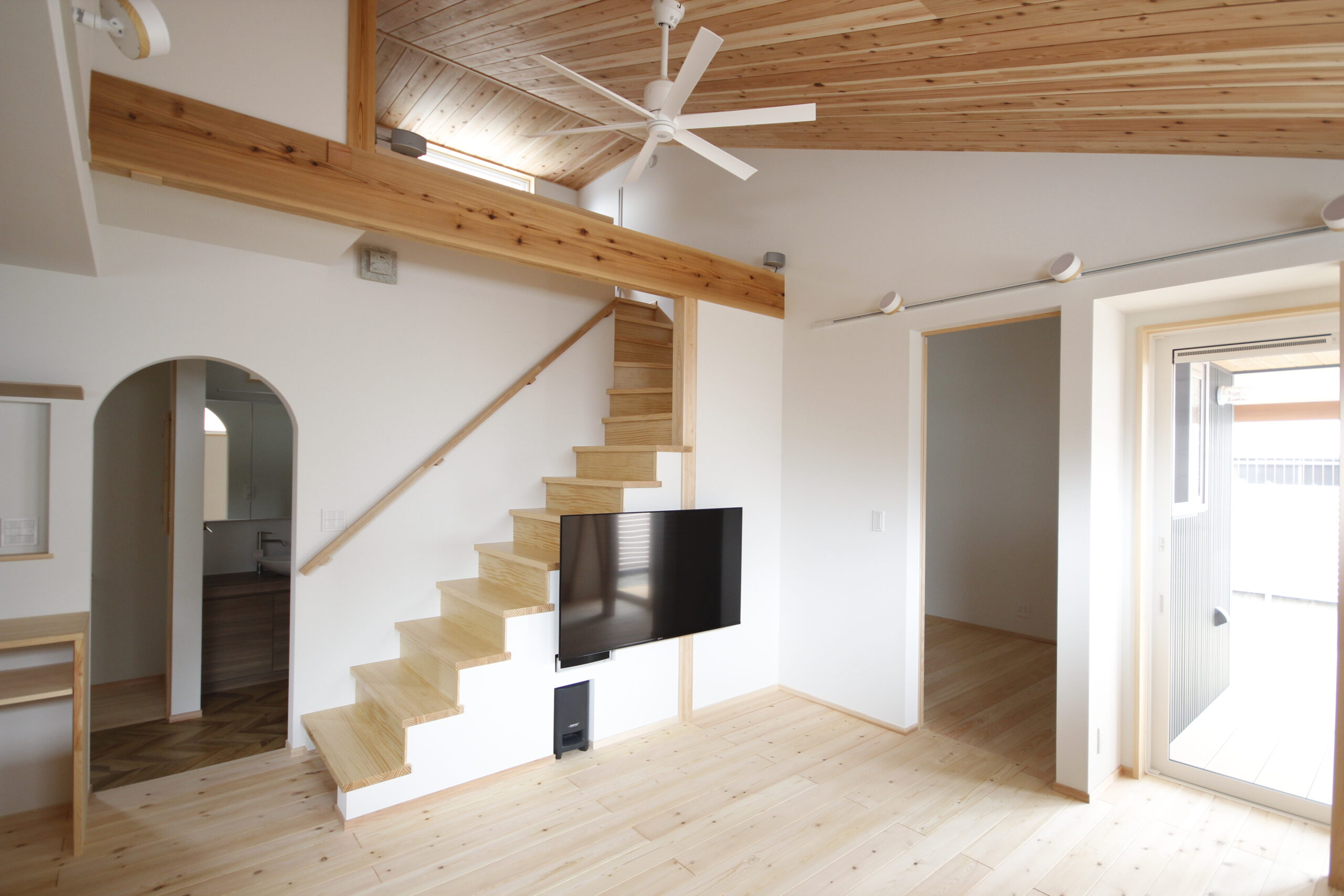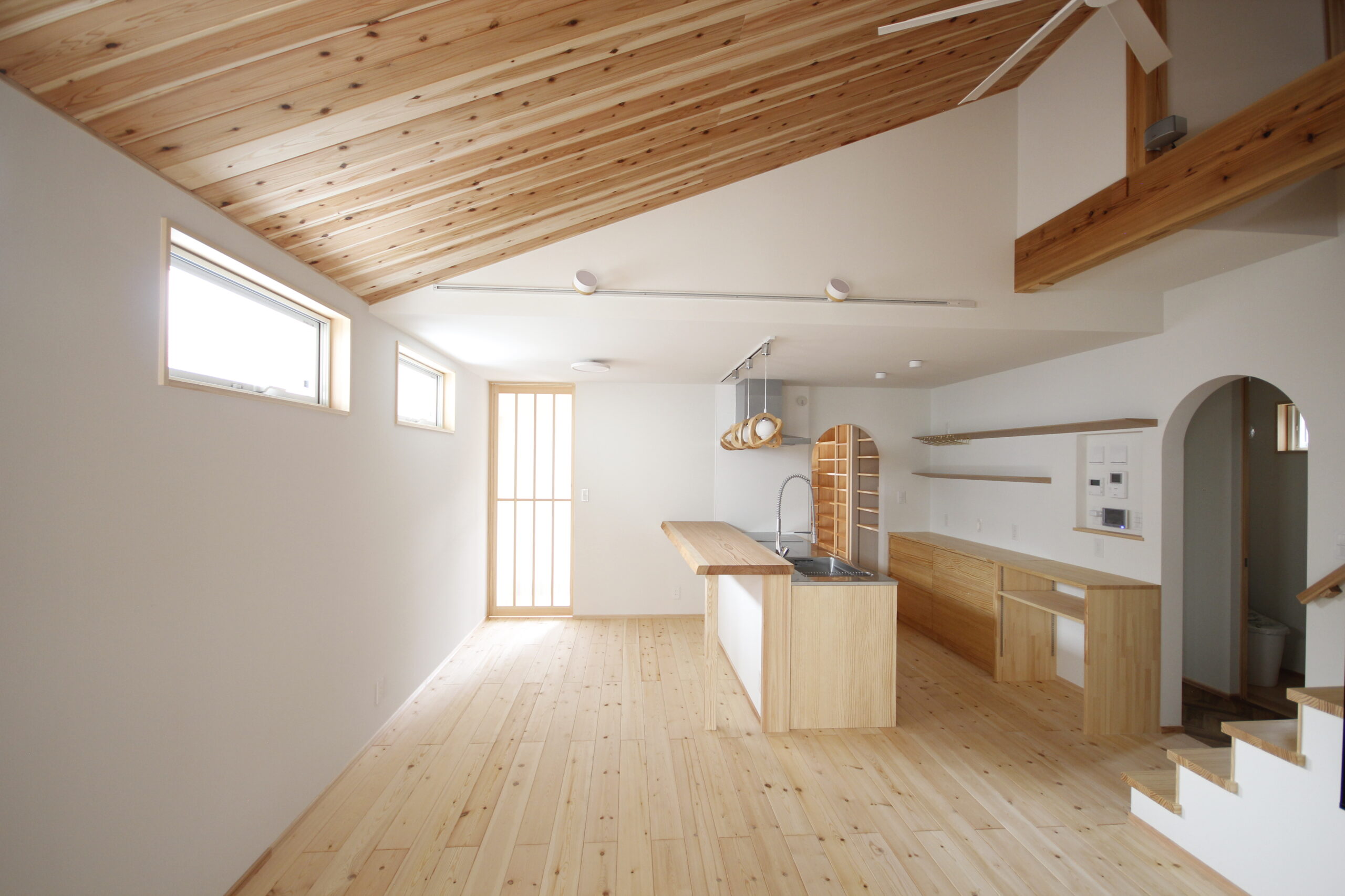 天井は杉材の羽目板 床材は赤松 壁紙は卵の殻からできたエッグパルプ 素材の質感と安心感が感じられます。
