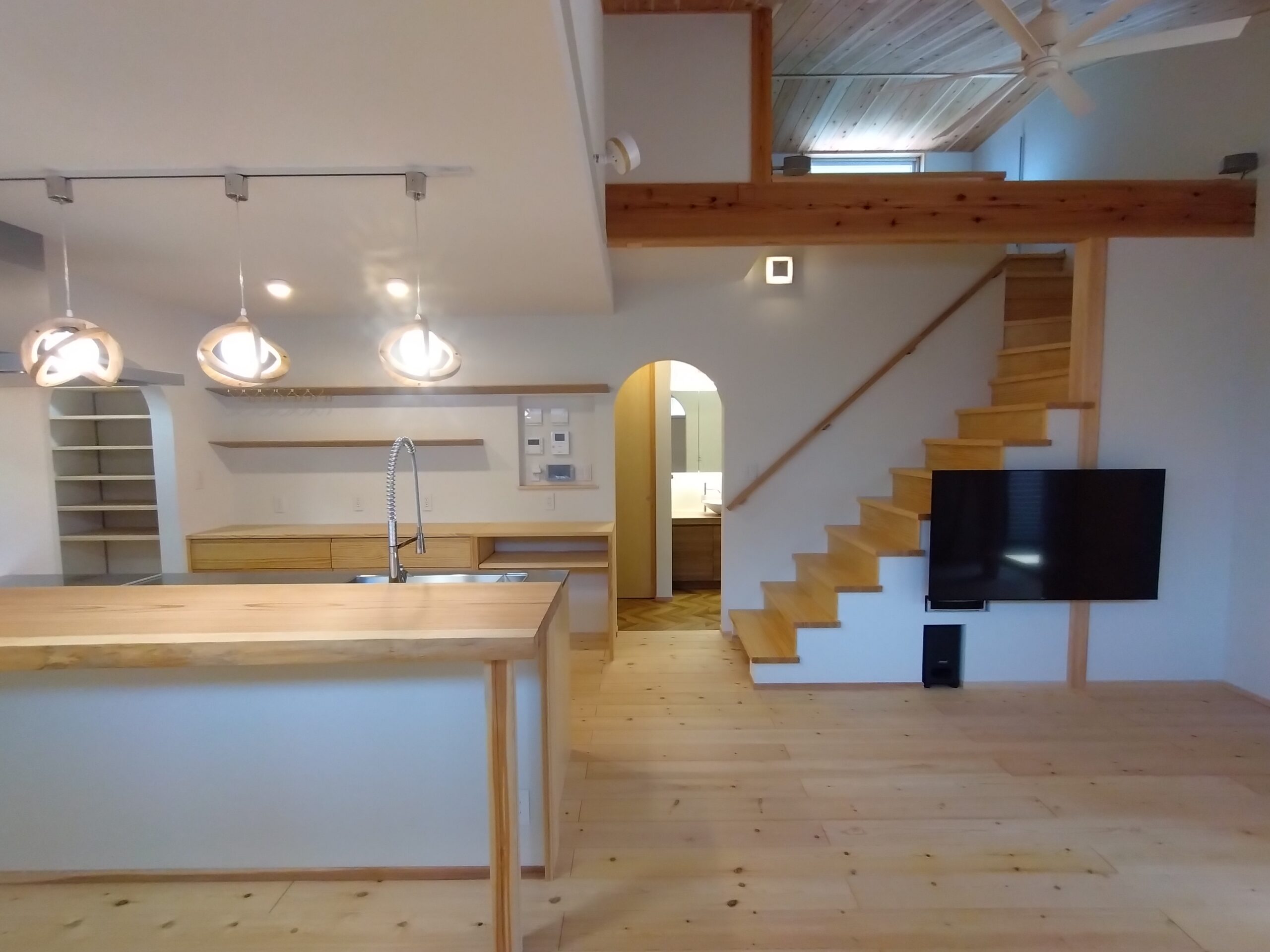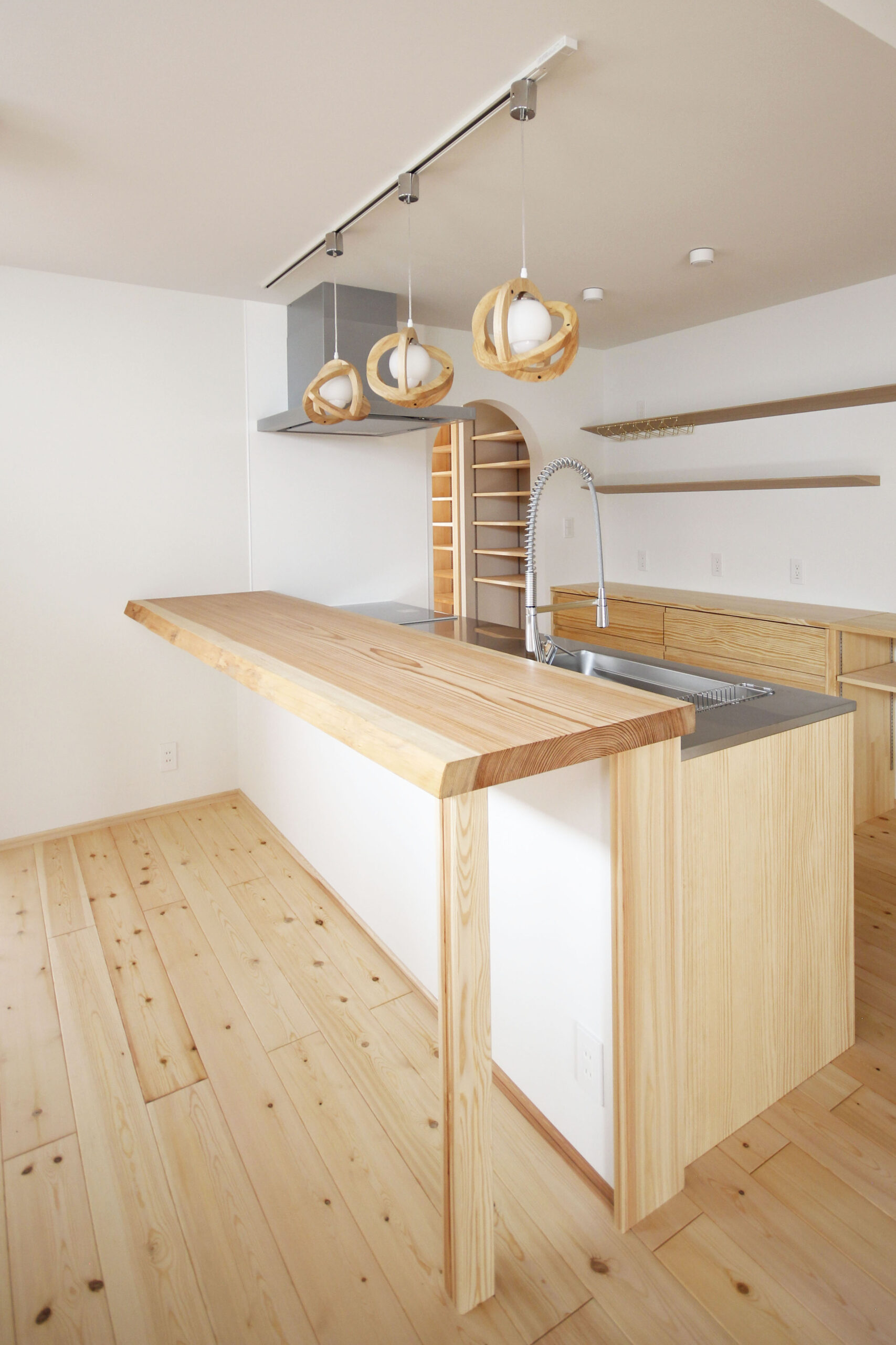 キッチンカウンターはW:2500 D:540サイズの存在感のある杉の無垢材。