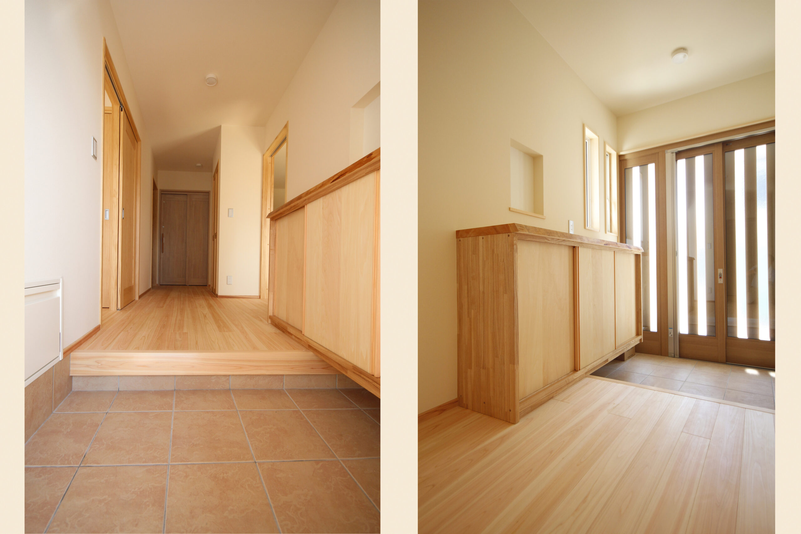大開口引戸の縦スリットから差し込む光で明るいホールには天板を一枚板を使用した玄関収納がある。