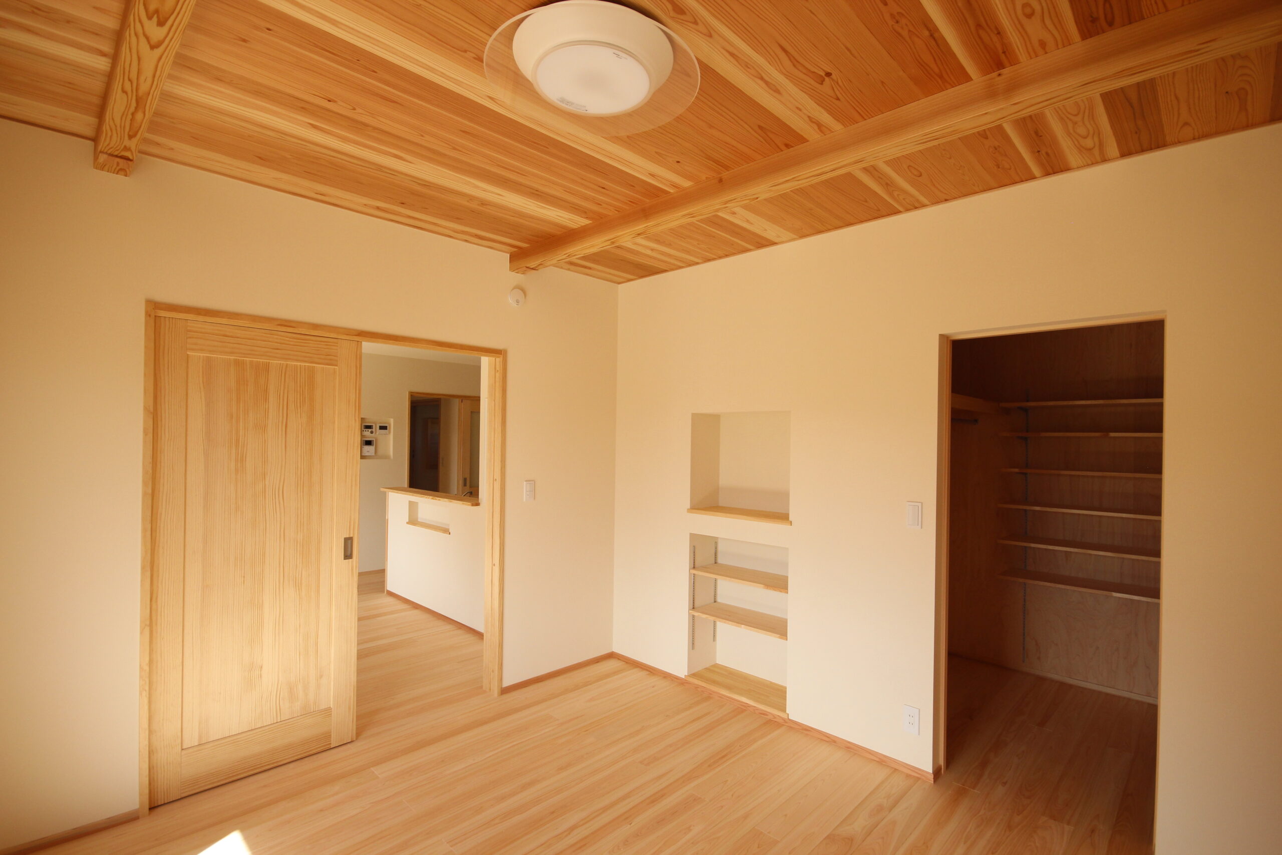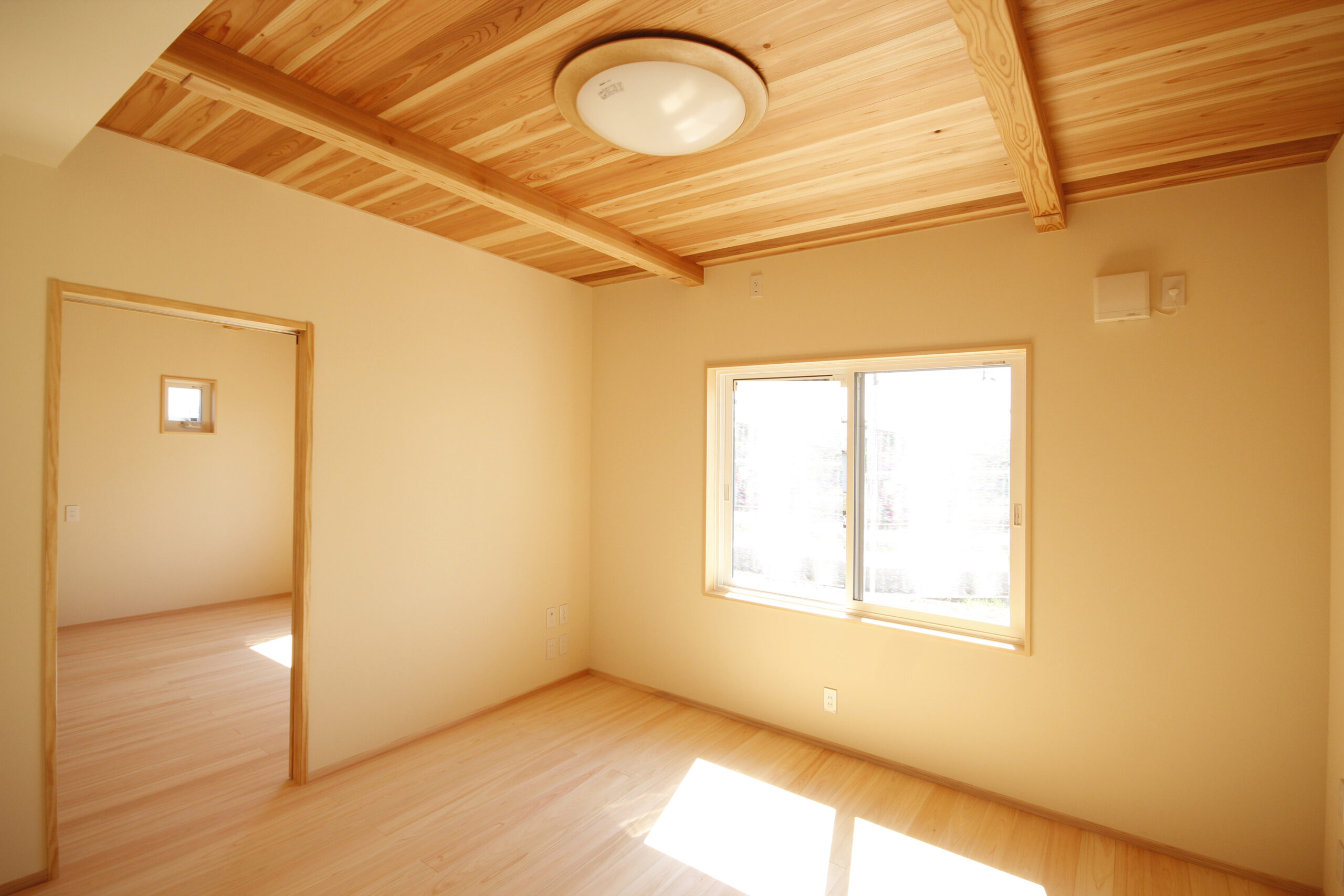 杉の羽目板材の天井は無垢材の色合いや柔らかな木目も楽しめ、化粧梁との組み合わせがお部屋のアクセントに。