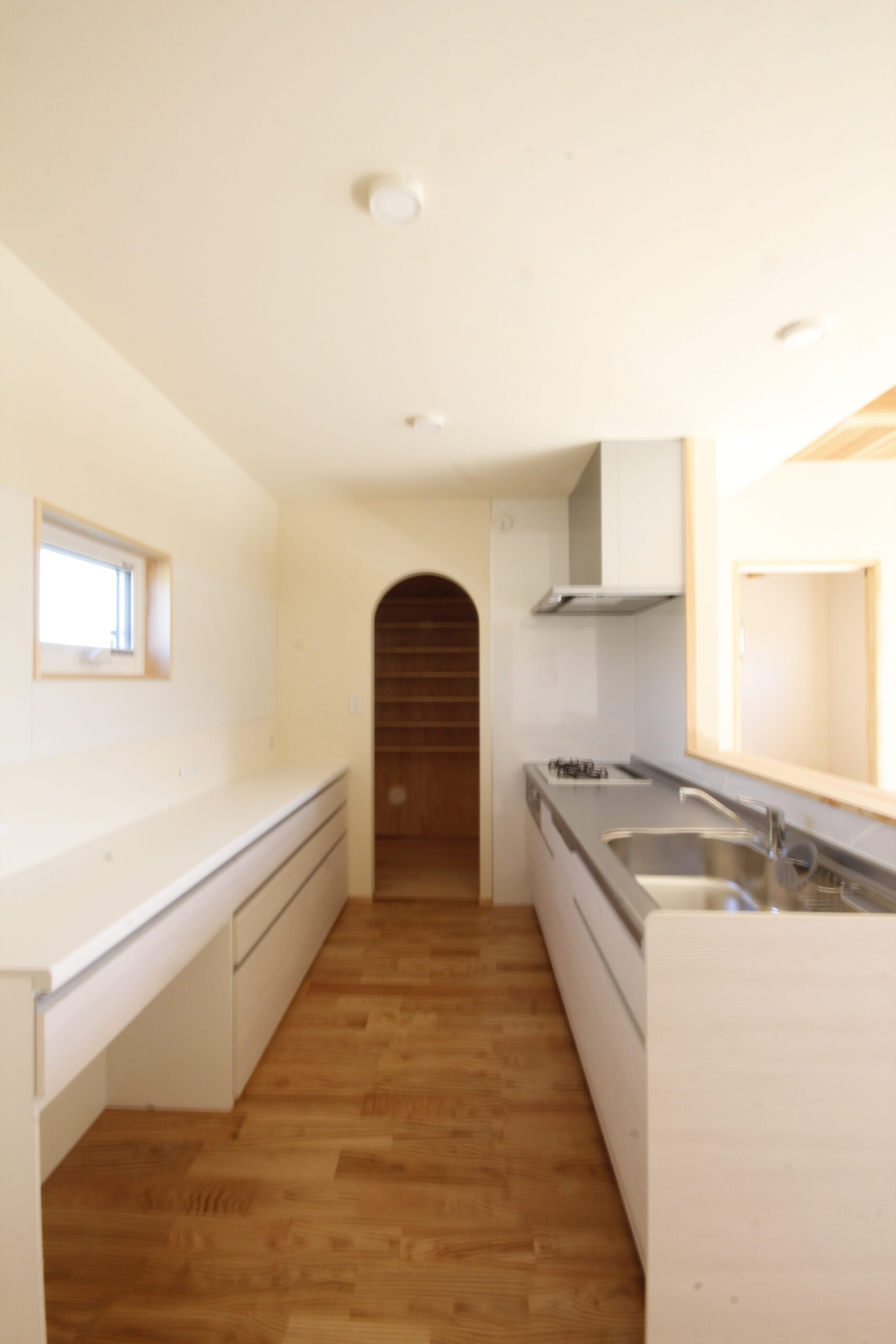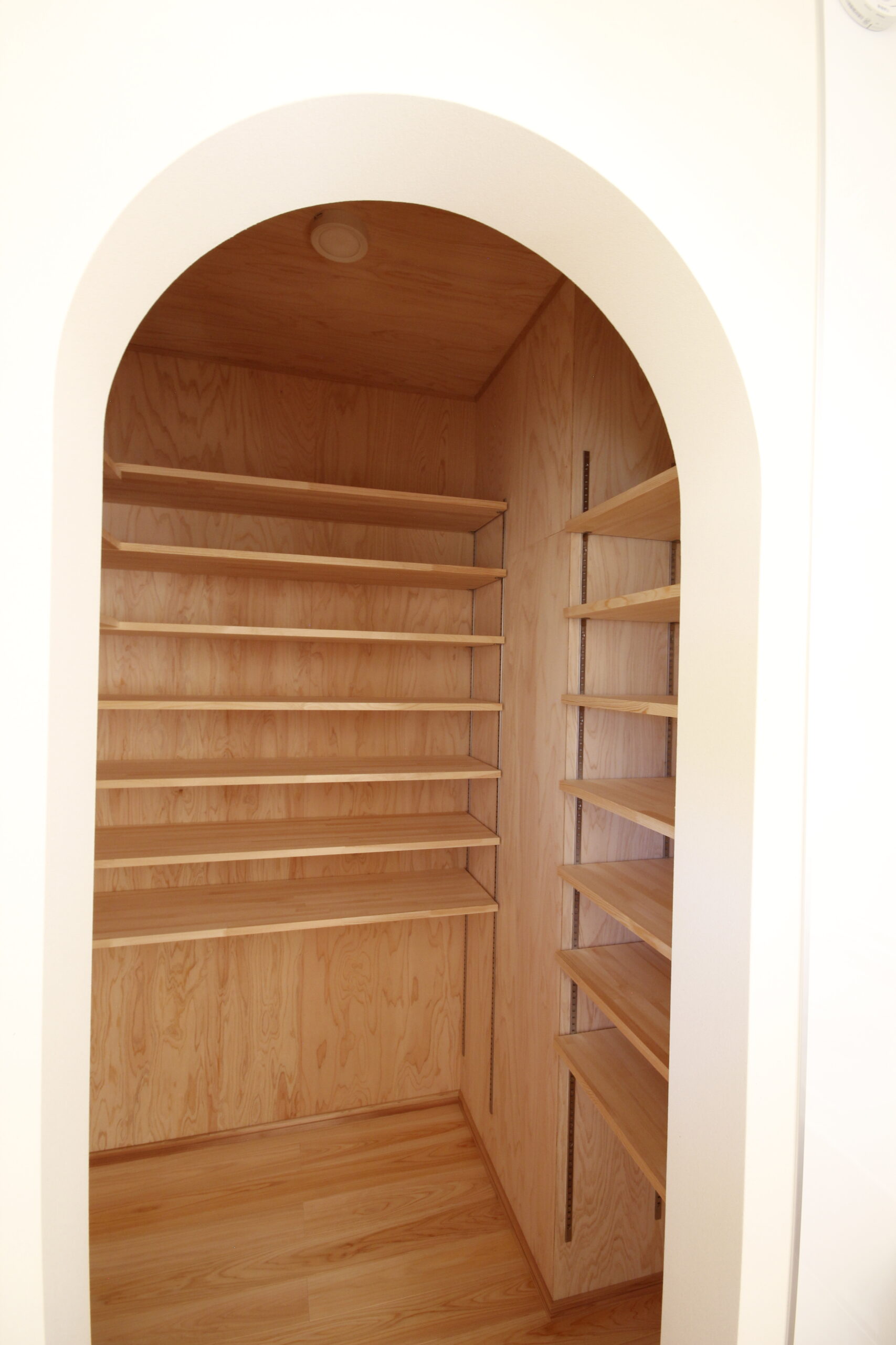 コの字型の可動棚を配置したことで食品のストックや冷凍庫を設置場所としても使い勝手の良い便利な場所。