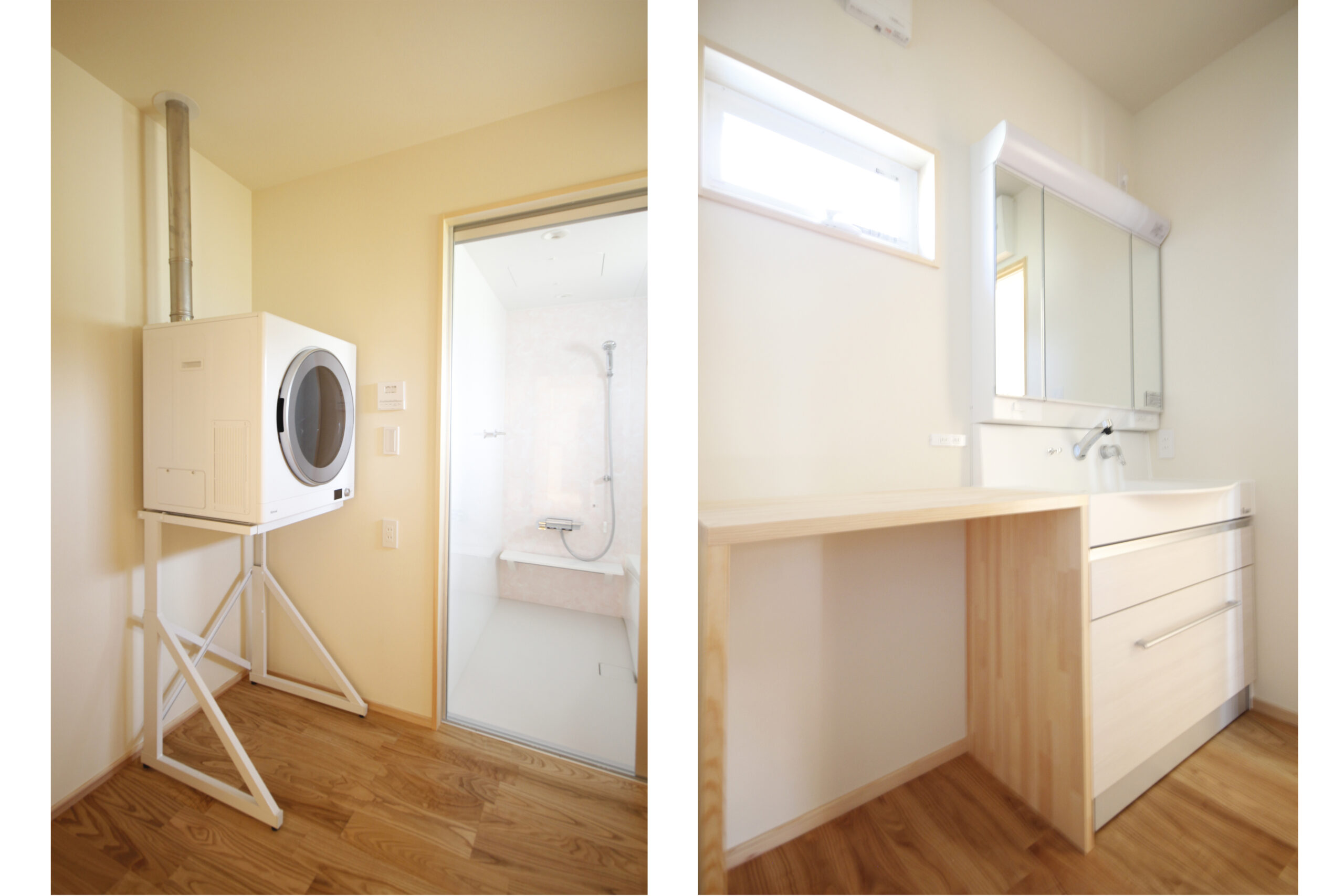 ランドリールームを兼ねている洗面脱衣室。床材はキッチン・洗面所・トイレなどの水回りには撥水材を塗布した栗材を採用。